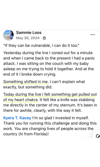 By participating in any membership, mastermind, video recordings, live performances or related offerings facilitated by Kyera Kacey of LiberateHER™, Courageous Conversations LLC (hereinafter referred to as "the Company"), you acknowledge and understand that the content presented may include adult language, adult entertainment, or possible nudity and discussions of trauma, violence, sexual content, and other sensitive topics. The Company employs a no-filter approach, which may include the use of curse words and exploration of taboo subjects. Participation in all programs, events, and discussions is completely voluntary. By choosing to participate, you do so at your own discretion and agree to take full responsibility for your experience. The Company, its employees, affiliates, and representatives are not liable for any personal reactions, emotional distress, or discomfort that may arise from the content or discussions presented. You agree to the no refund and no chargeback policy by submitting payment. The Company cannot and does not give any guarantees on results or earnings with our information, courses, programs, live events, memberships, masterminds, master courses, coaching, plans, tools, or strategies. You recognize and agree that nobody and nothing part of the Kyera Kacey brand has made any implications, warranties, promises, suggestions, projections, representations or guarantees whatsoever to you about future results or earnings, or that you will earn any money, with respect to your purchase of Kyera Kacey’s programs, courses, trainings, masterclasses, memberships, master courses, or coaching, and that we have not authorized any such implication, promise, or representation by others.