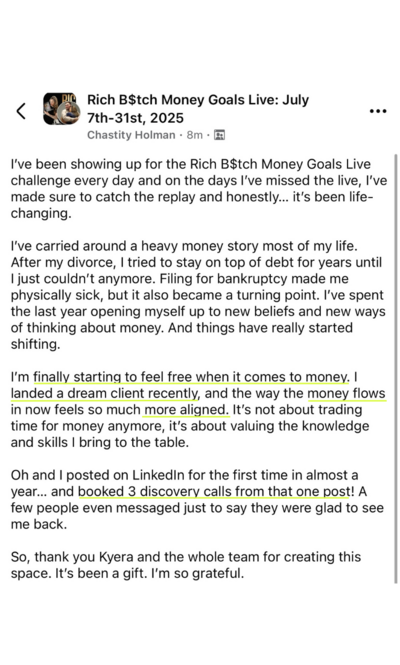 Inside this experience, Kyera breaks down exactly what it means to be a Rich B$tch by definition—and what wealth represents as the non-negotiable standard inside the Rich B$tch community.